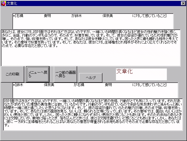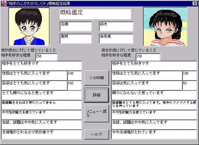 なら超激安!! &鑑定申し込み)「相手の心がわかるソフト」の鑑定書のみなら格安! 例として、君島明と吉川十和子の心の中を読んでいます |